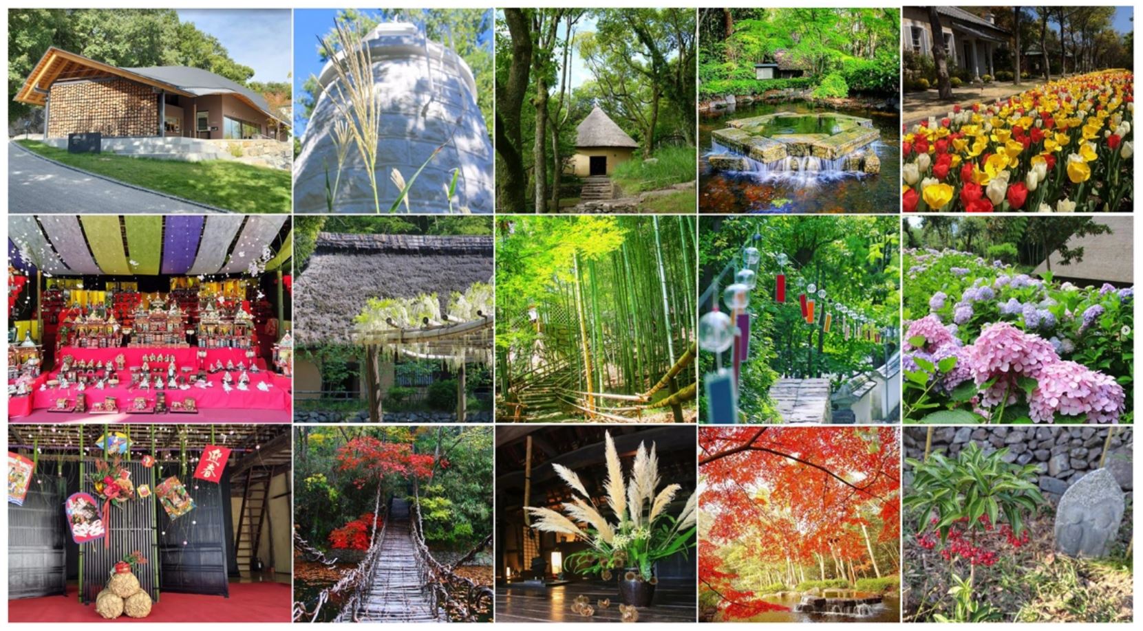 四国村ミウゼアムは広い園内に季節ごとに様々な花が咲き、早春にはスイセンや梅、サクラ、初夏にはチューリップ、新緑やバラ、アジサイ、秋には紅葉など四季折々に異なる魅力を楽しんでいただくことができます。また季節ごとの節句飾りを楽しみにして、カメラを携えてお越しいただく方もたくさんいらっしゃいます。