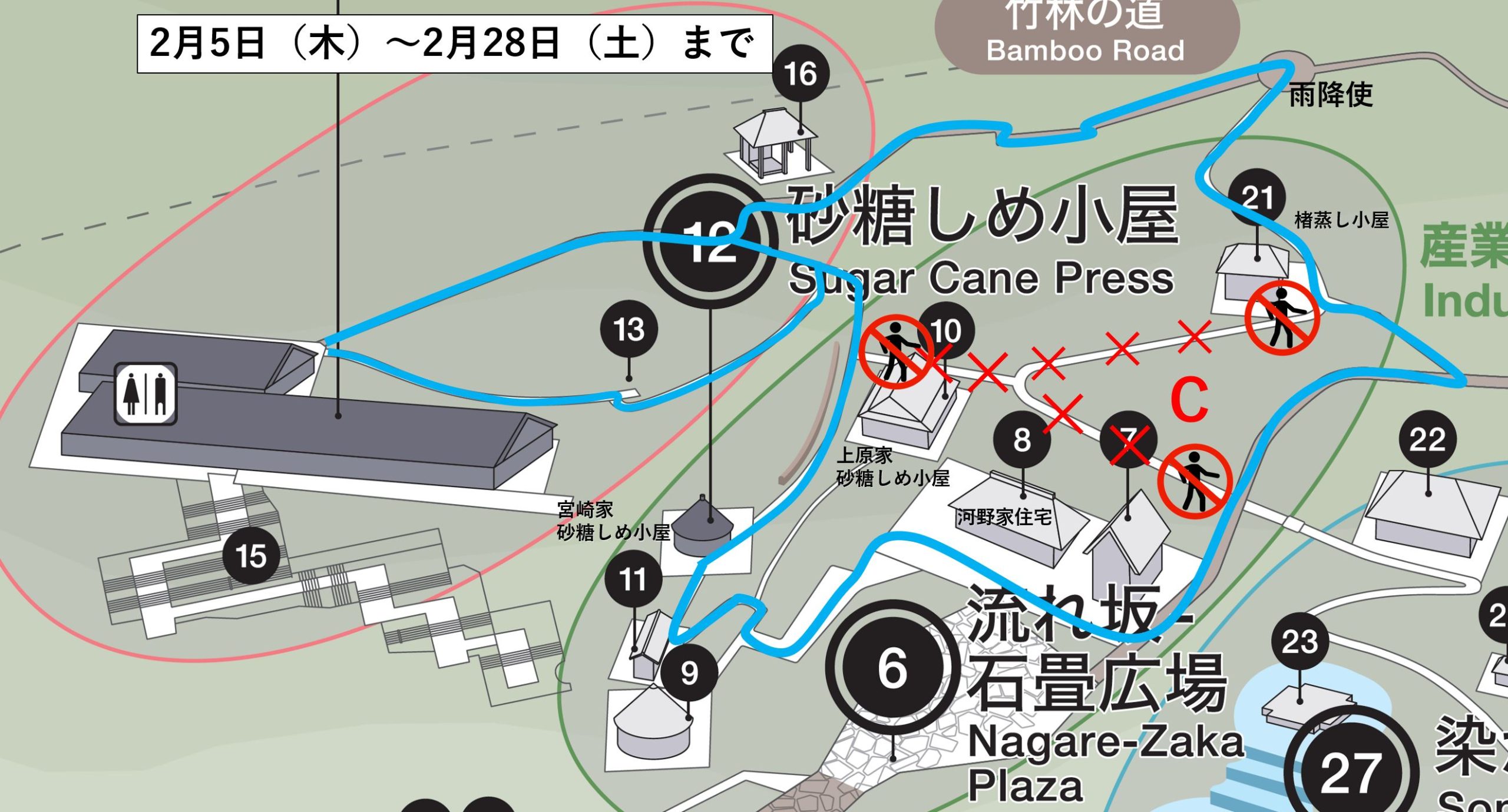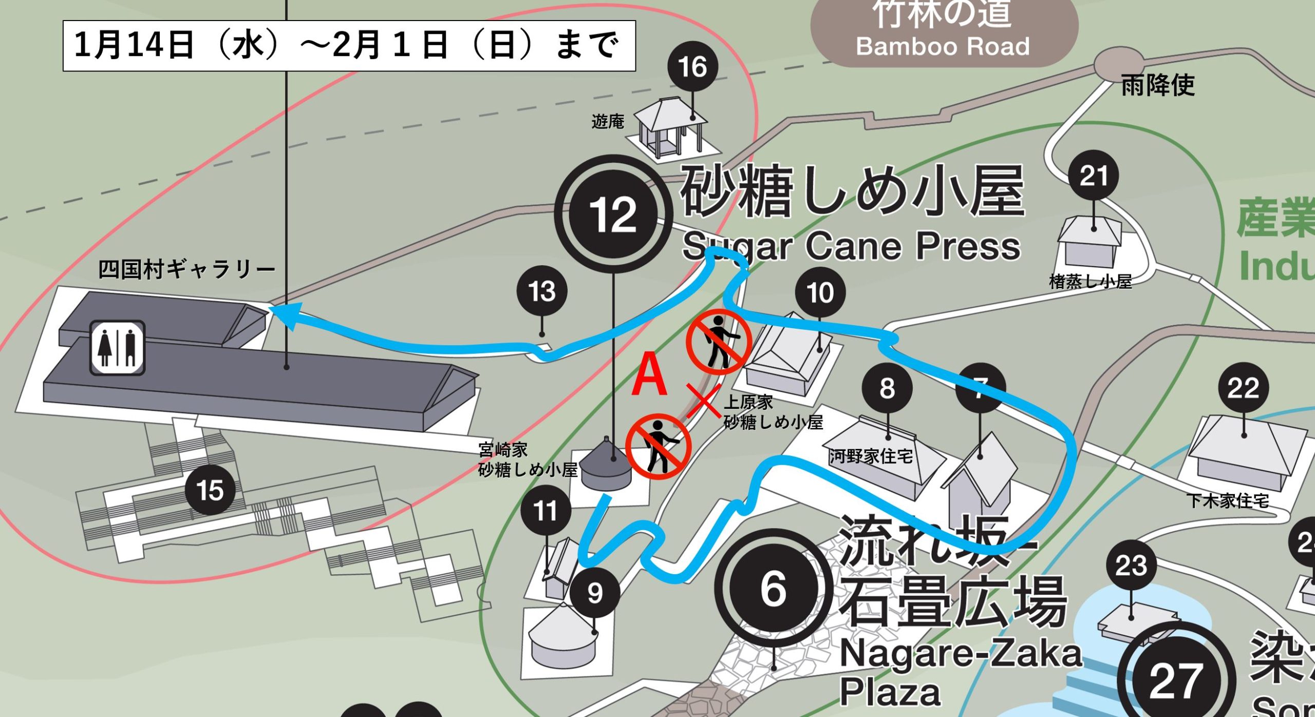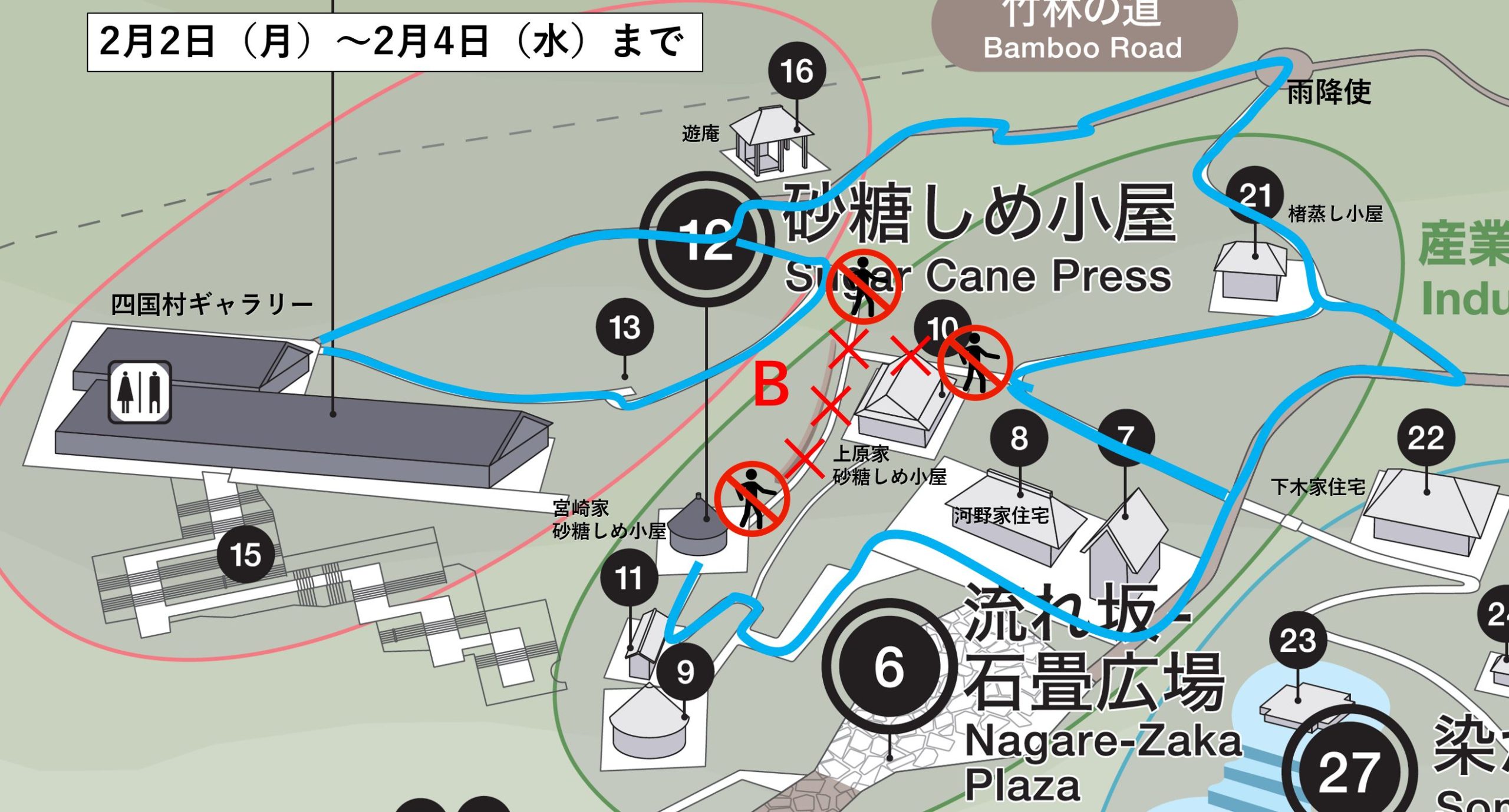 新たに上原家砂糖しめ小屋わきの部分が通行できなくなり、下図Bで示したエリアがお通りいただけなくなります。