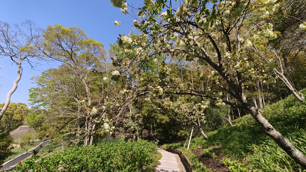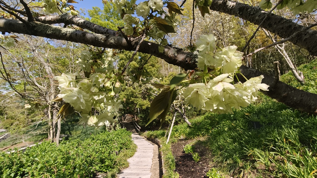 村内でもウコンザクラが咲き始めました。薄黄緑色の花ですのでギョイコウサクラ(御衣黄桜)といわれる品種かもしれません。石畳広場から灯台エリアに向かって見晴らし坂を上り、猪熊の杜オリーブ園の向かい側周辺に数本植えられています。