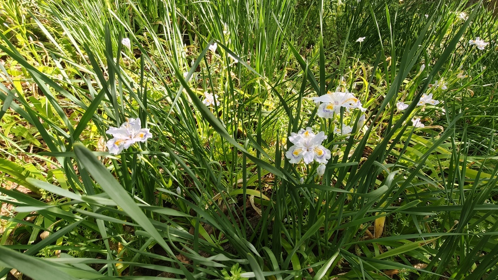 楮蒸し小屋の周辺では、シャガが可憐な白い花を咲かせています。