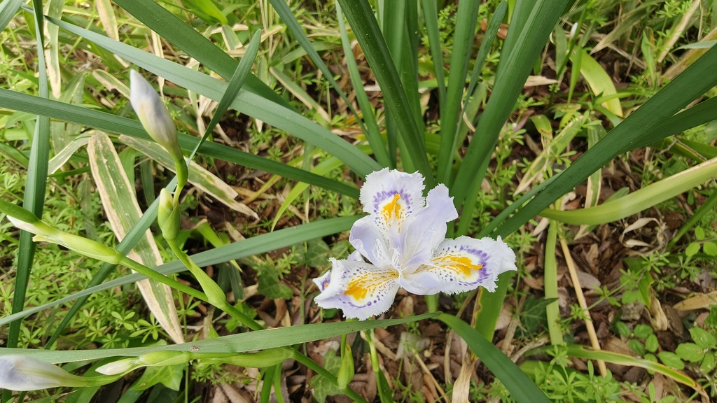 4月~ 5月ごろにかけて、白っぽい紫のアヤメに似た花をつけます。花弁には濃い紫と黄色の模様があるのが特徴です。