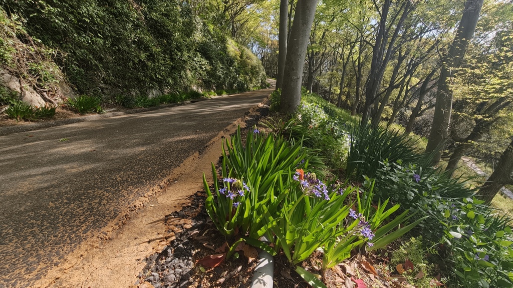 見晴らし坂を灯台エリアに向かって登っていくと、道の両側で濃い藍色の小さな花が咲いています。