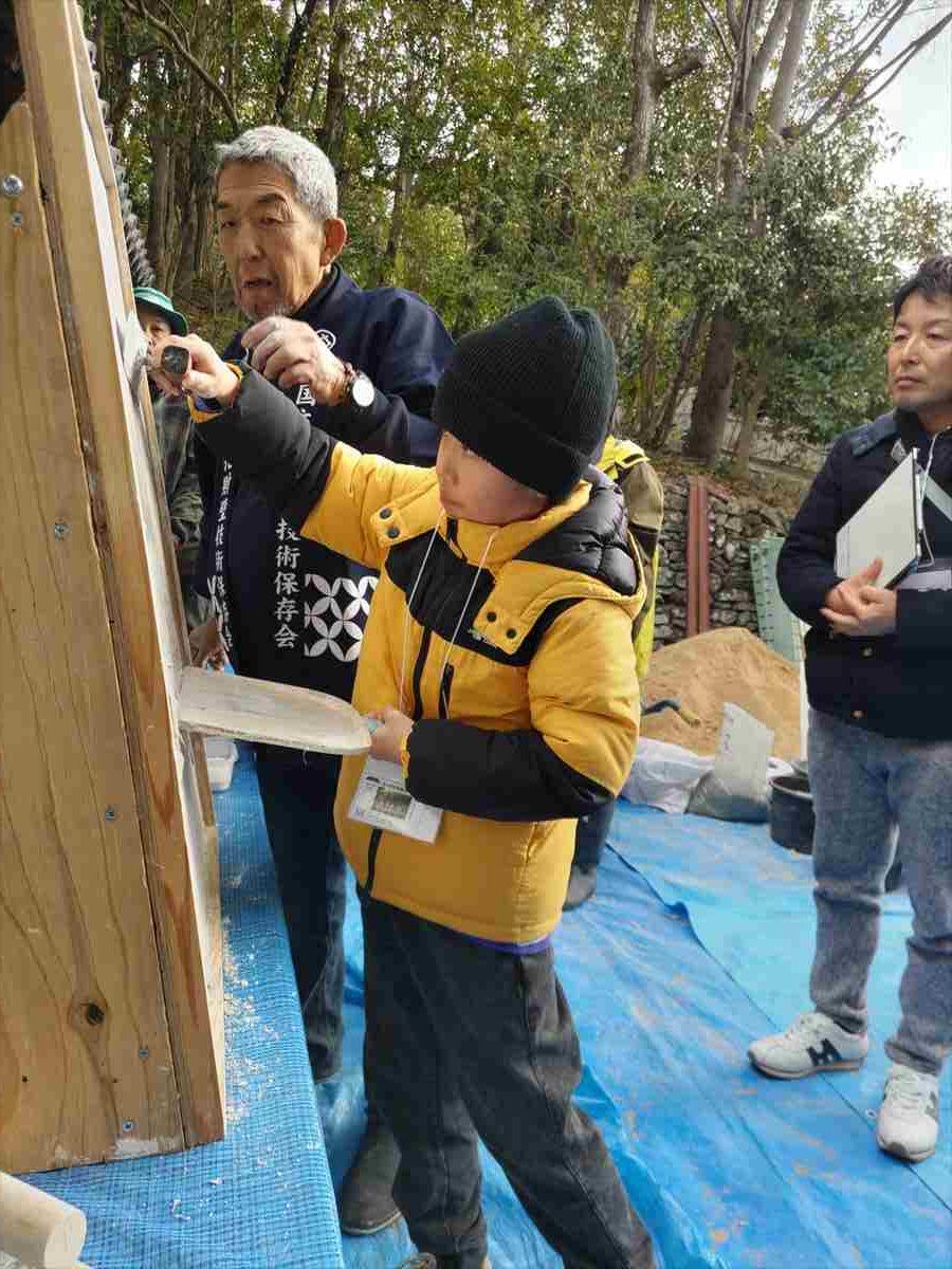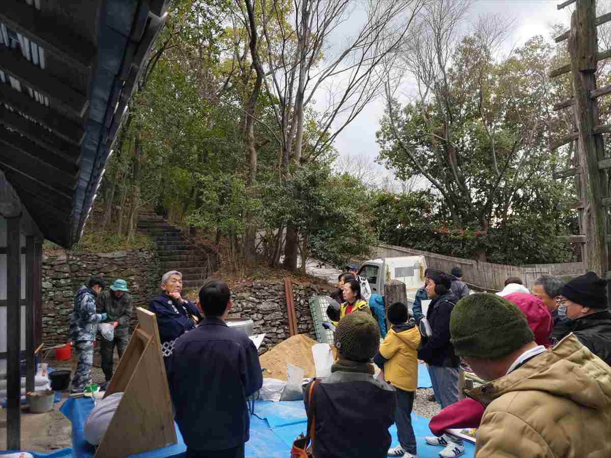 事業は香川県と高松市の補助金をいただいて進めてきましたが、先月には高松市の文化財保護担当の方にもお越しいただいて工事見学会を開催し、参加した方々に壁塗り体験や土間たたき体験をしていただきました。
