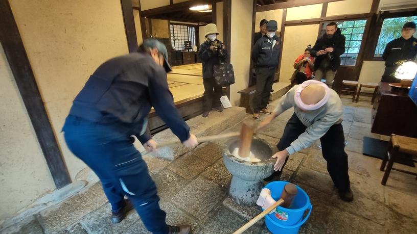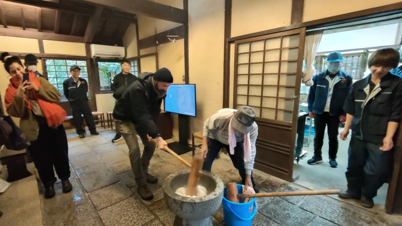 25日はあいにくのお天気でしたが、香港とフランスから訪れたお客様がいらっしゃり、餅つきに参加してくださいました。