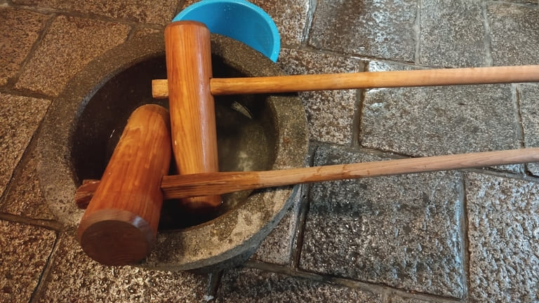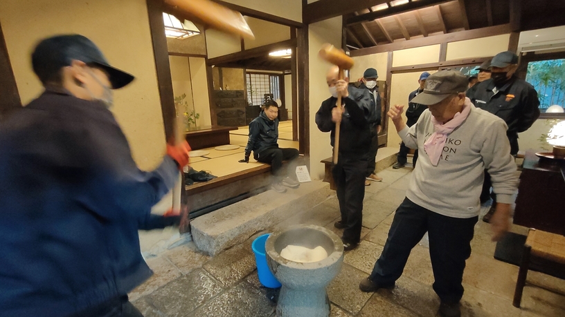 施設内の家々にお飾りするための鏡餅を中心に、25kgのお餅を半日近くかけてつきます。