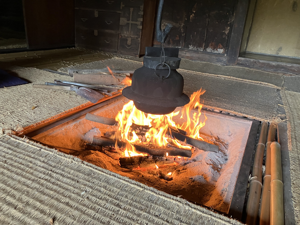 ふだんは民家の座敷にはお上がりいただけませんが、囲炉裏のときだけはお部屋にあがっていただき、囲炉裏で暖を取っていただくことができます。