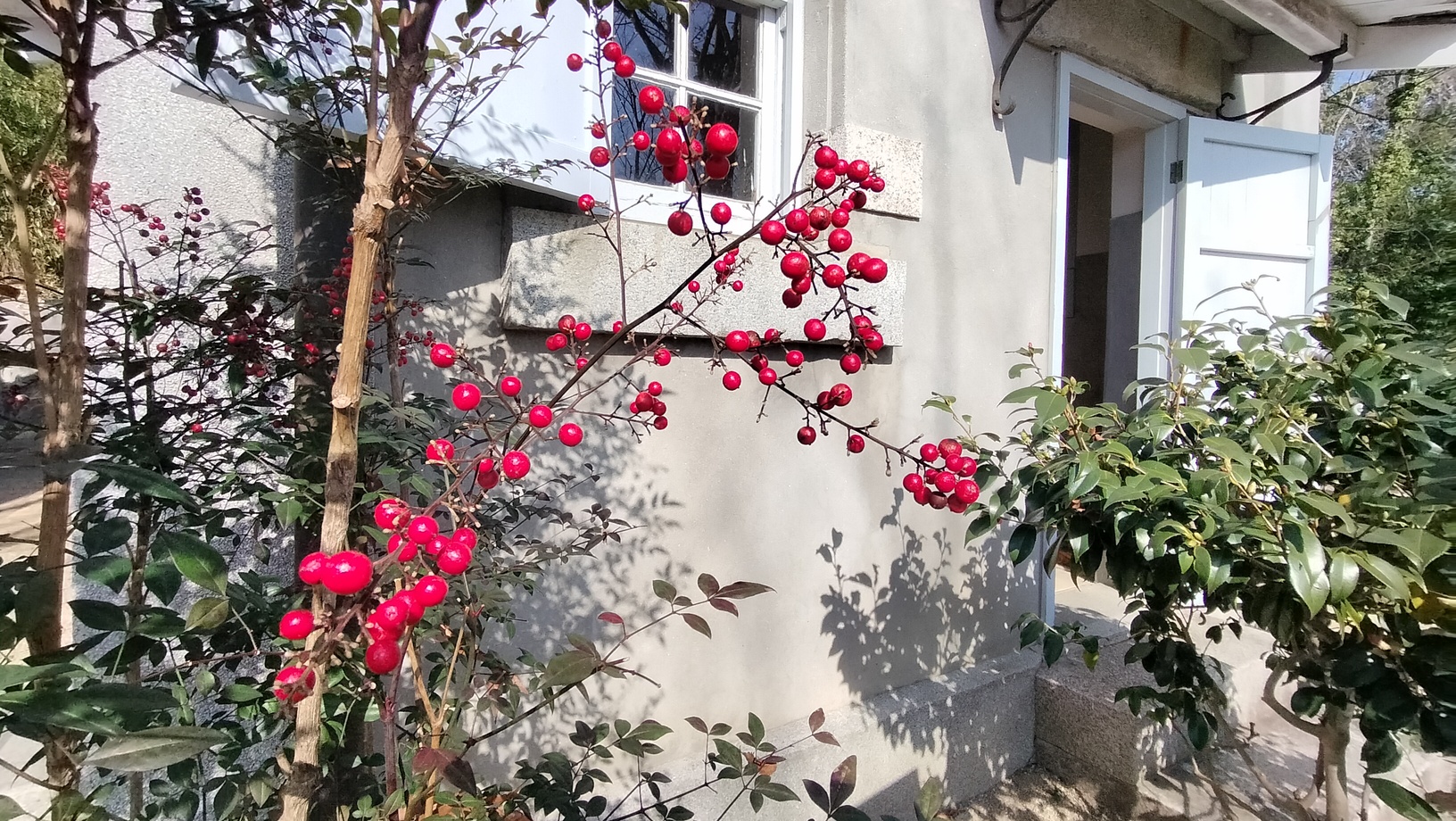 クダコ島灯台退息所の別棟前ではナンテンの赤い実が陽光を受けて輝いています。