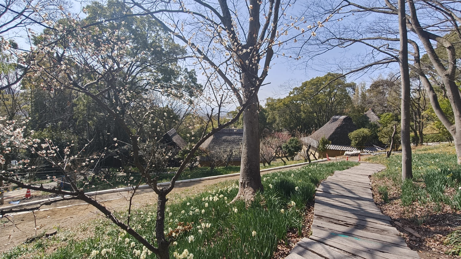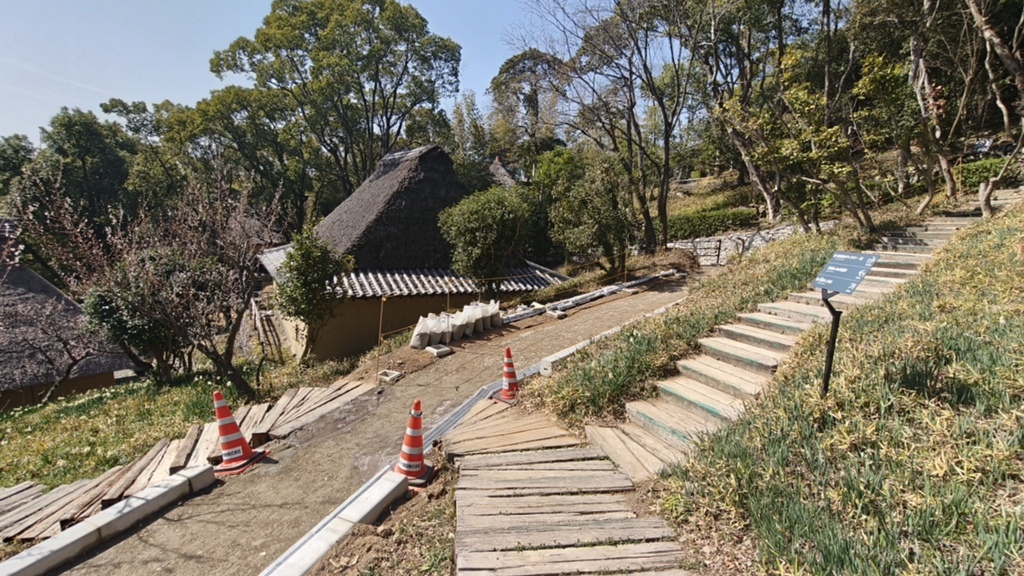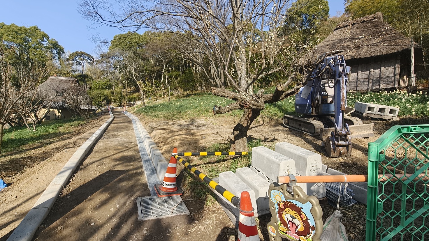 写真のように、梅林とスイセン畑の中を通るなだらかな傾斜の道を新たに整備しました。この工事によって、四国村入り口から階段を通らずに宮崎家砂糖しめ小屋や六車家釜屋などの施設をご覧いただけるようになります。