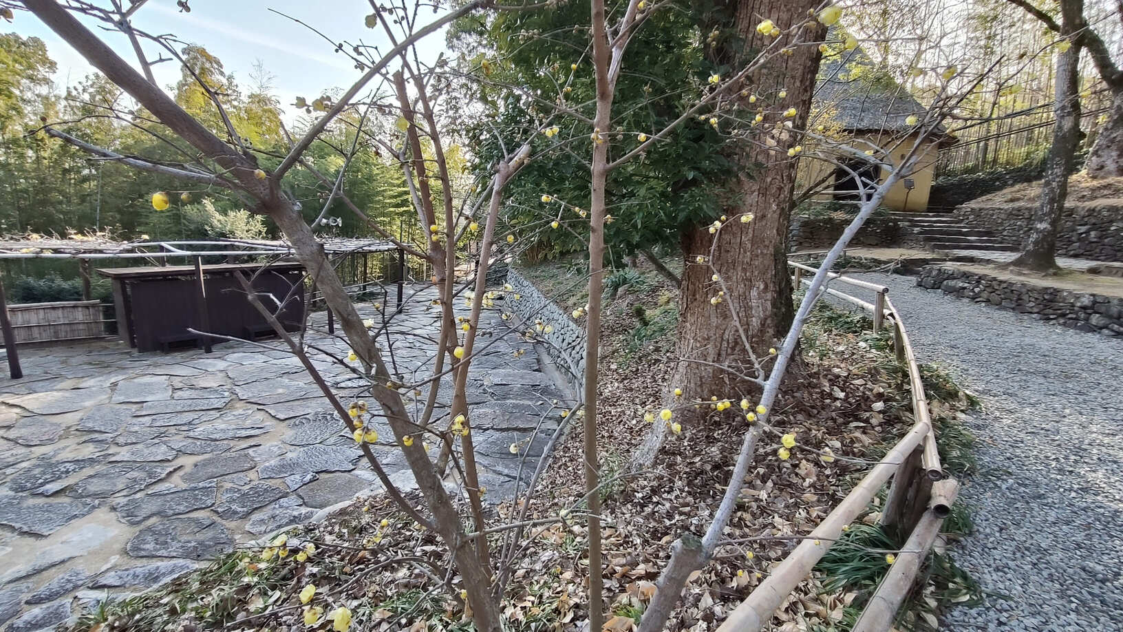 四国村では、河野家住宅前のほかに冨木田家砂糖しめ小屋付近、石造りのアーチ型橋付近でもロウバイの花をご覧いただけます。まだまだ寒いですが、この時期ならではの早春の香りを体験してはいかがでしょうか。