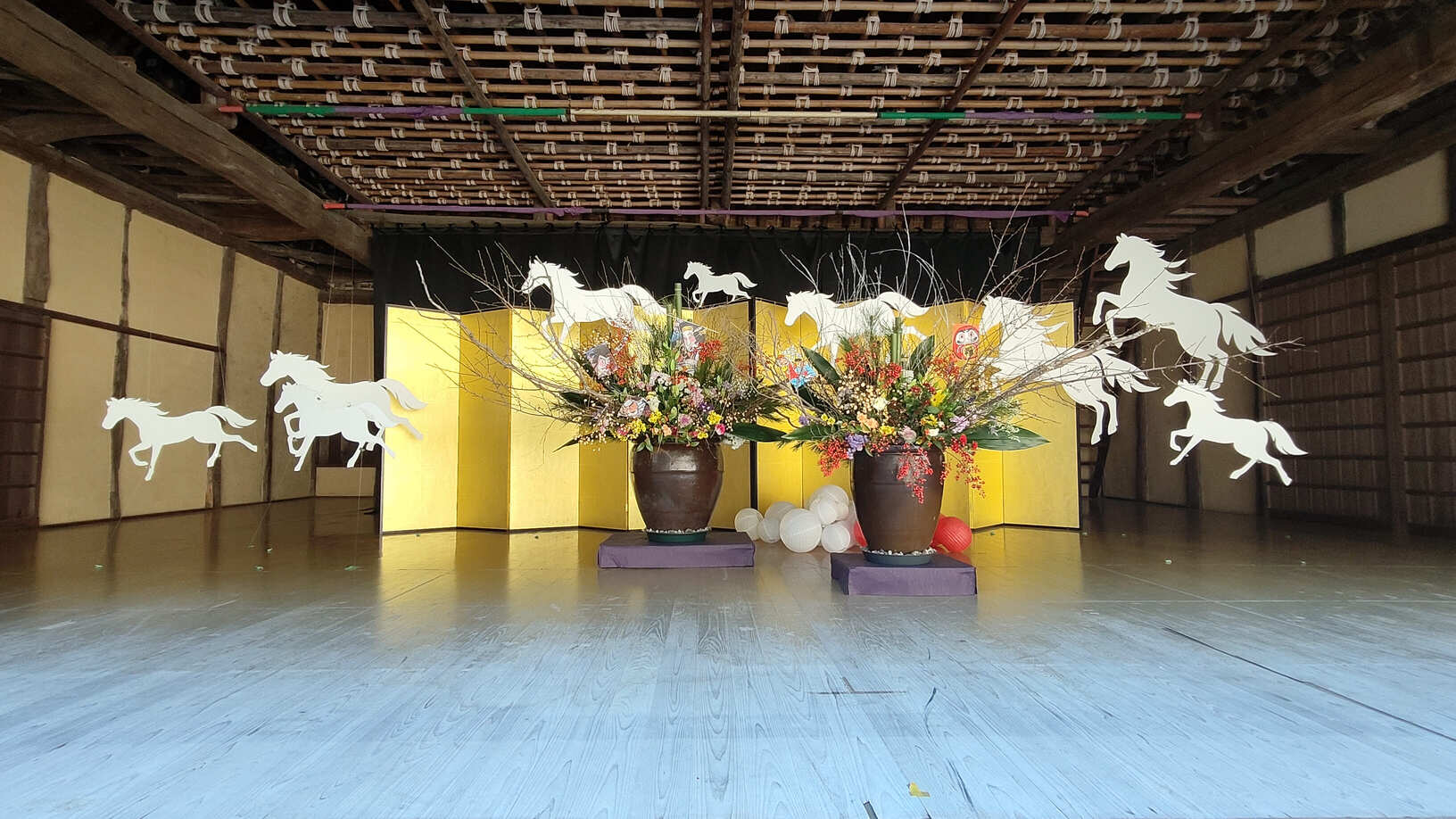 今年の干支にちなんだ「午」と生け花でお飾りしています。