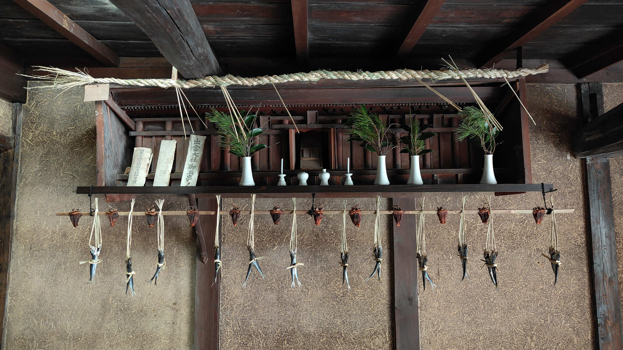 徳島県の海に近い海部郡美波町から移築した吉野家では、イワシなど地元でとれる魚を使ったお正月飾りを神棚にお供えします。